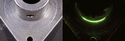 目視では検出できない微細な欠陥を鮮明に描き出す蛍光浸透探傷剤「ネオグロー」。暗所において欠陥部が鮮やかな黄緑色の指示模様として輝きます。