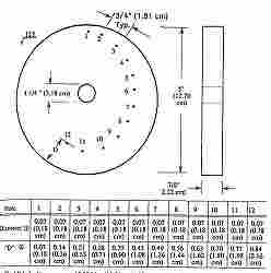 ケトスリングは直径5インチ、厚さ0.875インチで、中央に直径1¼インチの穴があります。このブロックには、外径表面から0.070、0.140、0.210、0.280、0.350、0.420、0.490、0.560、0.630、0.700、0.770、および0.840の距離に、直径0.070の穴(12個)があります。