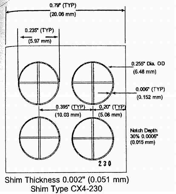 CX4-230 4 つの円形と十字形の切り欠きシム厚さ50μm厚- 傷深さシムの厚みの 30%